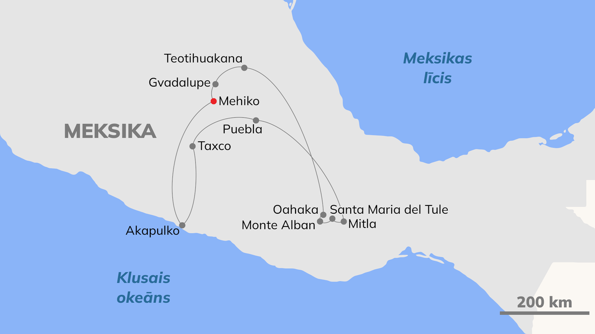 Meksika ir valsts ar daudzām sejām, kas slavena ne tikai ar seno civilizāciju vēstures pieminekļiem un pasakainām pludmalēm, bet arī ar iespaidīgām fiestām un atklātiem, priecīgiem cilvēkiem – maiju, acteku un spāņu kolonizatoru pēctečiem. Bagāta kultūra, skanīga folklora, unikāli dabas ainavu skati, eksotiski meksikāņu virtuves ēdieni, skaistas un rosīgas koloniālās pilsētas, kas pazīstamas ar mākslas galerijām un juvelieru darbnīcām, un mazi meksikāņu ciematiņi, un, protams, viena no lielākajiem pasaules megapolēm – Mehiko pilsēta. Ceļojuma nobeigumā atpūta Akapulko – kosmopolītiskā, greznā kūrortā, kas vilina ar savām pludmalēm, veikaliem un nerimstošo rosību.