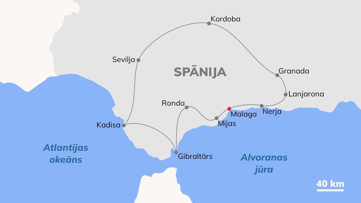Andalūzijā var atrast visu: flamenko ritmus, kastanjetes, bullīšu cīņas, vēstruiskas ēkas, smilšu pludmales un, protams, Spānijas sauli. Katrs reģiona stūrītis atgādina Lielā Rietumu kalifāta laikus, tāpēc šeit ir ne tikai arābu mantojums, bet arī pieminekļi, kas pieder klasiskajai Spānijas kultūrai. Ceļojuma laikā tiek apmeklētas interesantākās reģiona vietas: mauru mantojums Kordobā, Seviljā un Granadā, skaistā un unikālā vietā esošā Ronda, UNESCO sarakstā iekļautie pieminekļi un mazi burvīgi ciematiņi, ugunīgais flamenko šovs un ekskursija pa Gibraltāru.
