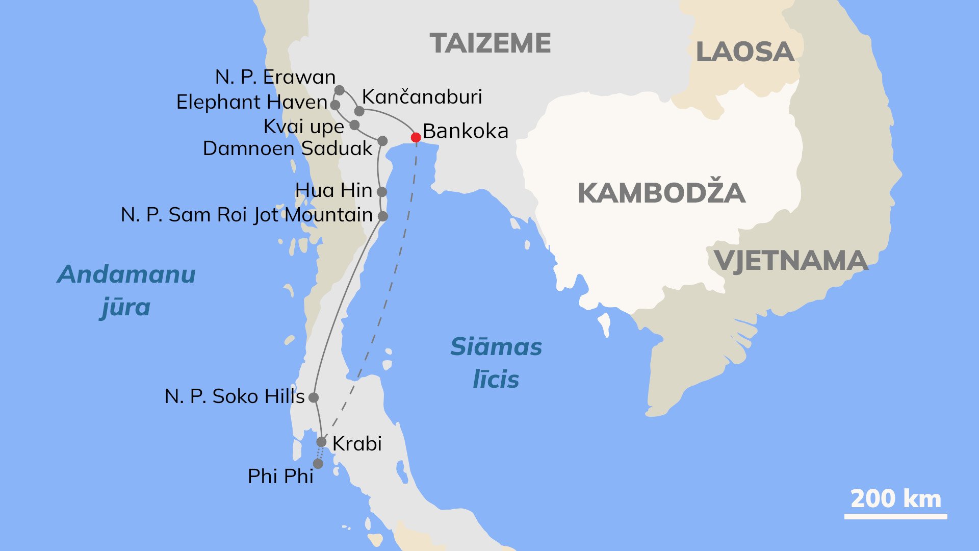 Bangkoka • Kančanaburi • Nacionālais Parks Erawan • Elephant Haven ziloņu rezervāts • Kvai upe • Peldošais tirgus Damnoen Saduak • Hua Hin • Nacionālais Parks Sam Roi Jot Mountain • Nacionālais Parks Soko Hills • Krabi • Phi Phi • Bangkoka