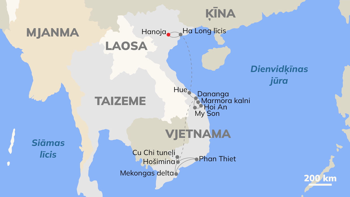Vjetnama- valsts, kur sievietes joprojām nēsā konusveida cepures, kur daba apbur ar pasakaini skaistām ainavām, kur acis priecē vēsturiskie pieminekļi un bagātā kultūra, kas saglabājusies, neskatoties uz vētraino valsts vēsturi. Programmā – kruīzs Ha Long līcī, kur no tirkīzzilā ūdens paceļas fantastiskas kaļķakmens salas; peldvietas un rīsu lauki Mekongas deltā; Hue pagoda; kruīzs pa Smaržu upi; dzīvīgās pilsētas Hanoja, kura apburs ar vjetnamiešu ūdens leļļu teātra izrādi, Dananga ar unikālo Vjetnamas mākslas muzeju un Hošimina – bijusī Vjetnamas galvaspilsēta. Ienirsti šajā Āzijas krāsu kaleidoskopā!